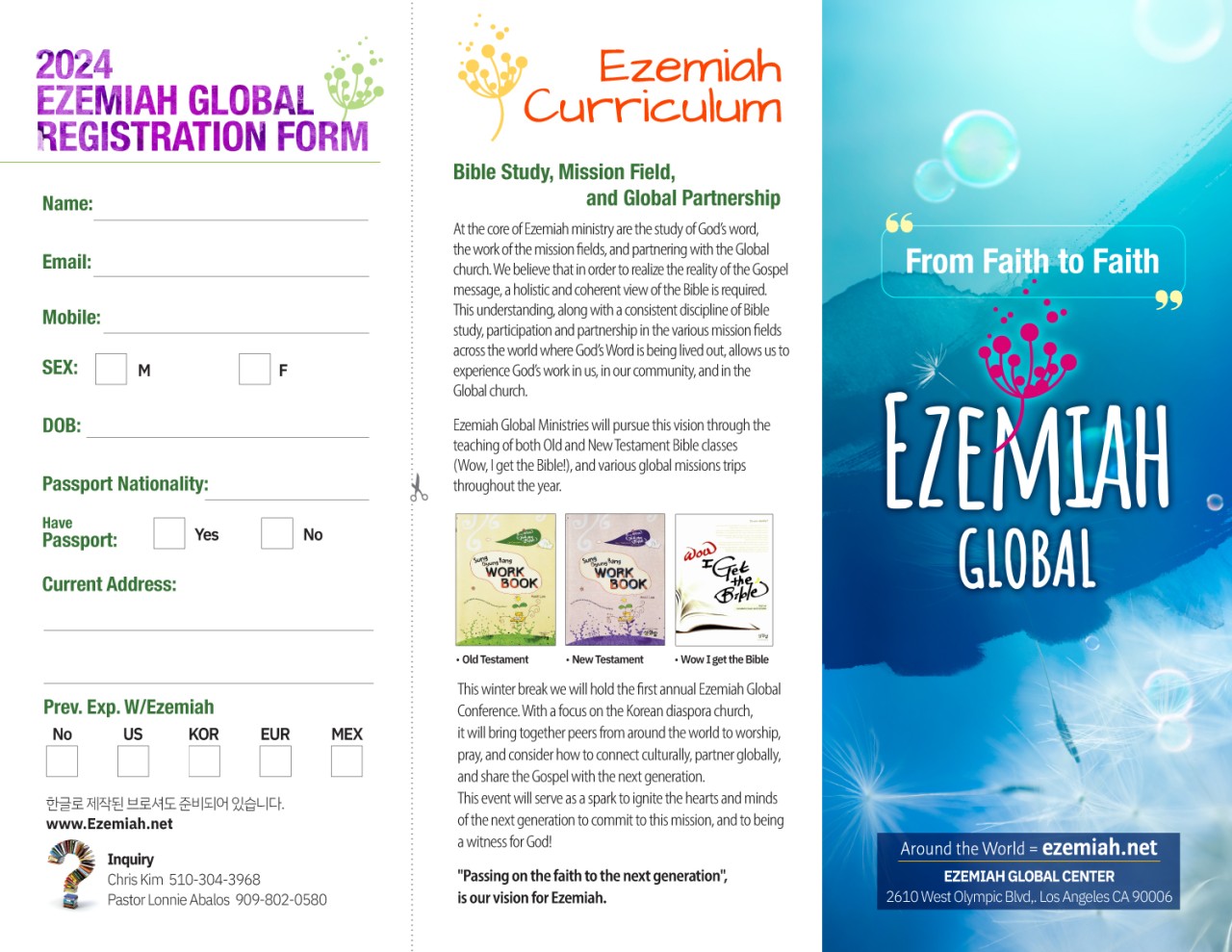2024 에즈마이야 글로벌 컨퍼런스 등록 중 페이지 정보 본문 에즈마이야 글로벌 컨퍼런스가 새해 2024년 1월 2일부터 5일까지 페퍼다인 대학교에서 진행됩니다. 현 8학년 이상 참여하실 수 있으며, 보다 자세한 사항은 김숙영 전도사 909-802-0580으로 문의하여 주시기 바랍니다. 관련링크 https://form.jotform.com/233096768436165 570회 연결 이전글 목록 다음글