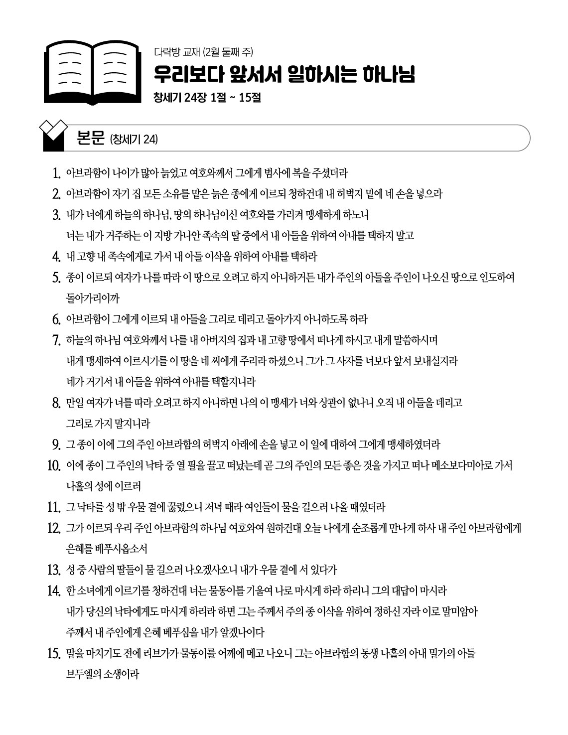 2022 2월 둘째 주 - 우리보다 앞서서 일하시는 하나님 페이지 정보 본문 첨부파일 2022년 2월 2째주 다락방 교재.pdf (130.8K) 94회 다운로드 | DATE : 2022-02-11 16:03:54 이전글 목록 다음글