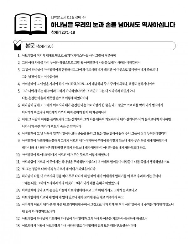 2021 11월 첫째 주 - 하나님은 우리의 눈과 손을 넘어서도 역사하십니다. 페이지 정보 본문 첨부파일 2021년11월1째주다락방교재.pdf (131.9K) 66회 다운로드 | DATE : 2021-12-07 16:56:11 이전글 목록 다음글