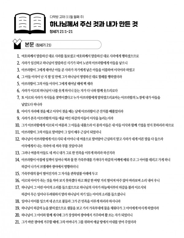 2021 11월 둘째 주 - 하나님께서 주신 것과 내가 만든 것 페이지 정보 본문 첨부파일 2021년11월2째주다락방교재.pdf (129.8K) 67회 다운로드 | DATE : 2021-12-07 16:56:53 이전글 목록 다음글
